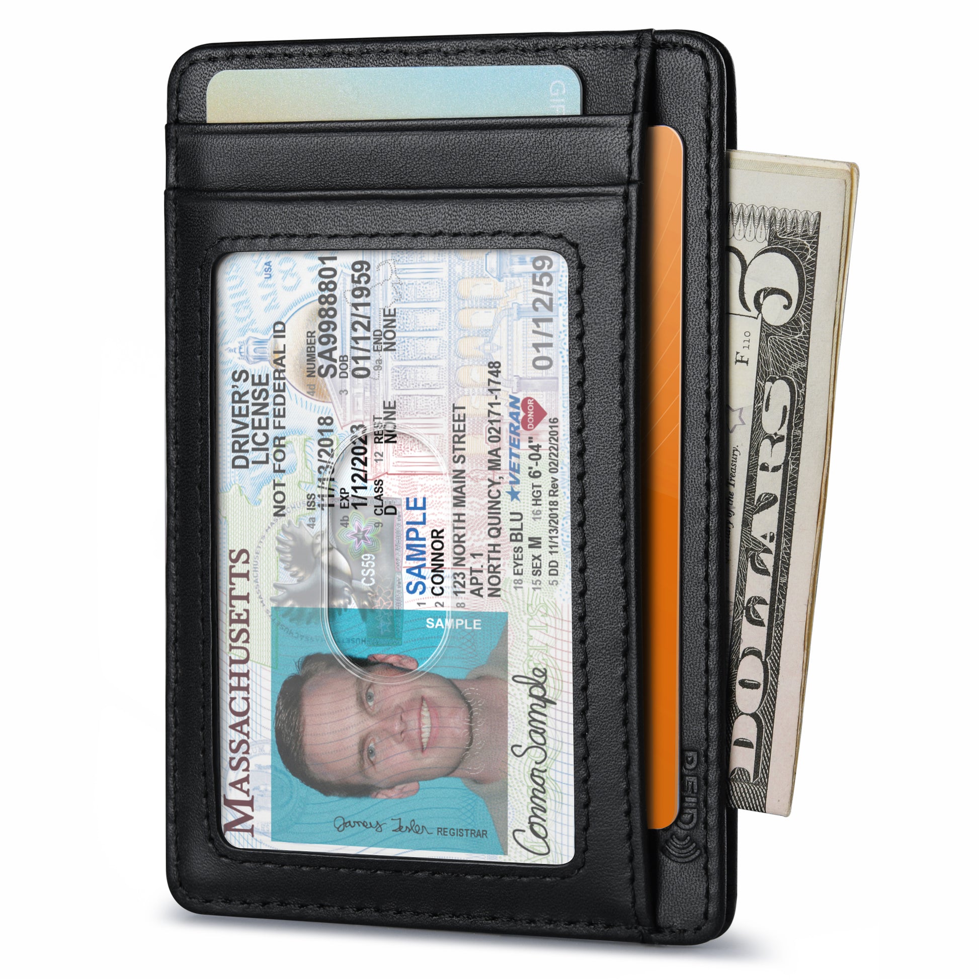 - TRUE UNISEX - The extremely practical thin wallets for men or women that include 4 credit card slots, one clear window slot with finger glide for ID, Work ID or driver's license, 2 Side-slip pockets for carrying debit cards, membership cards or business cards etc and the middle pocket for cash or receipts etc.